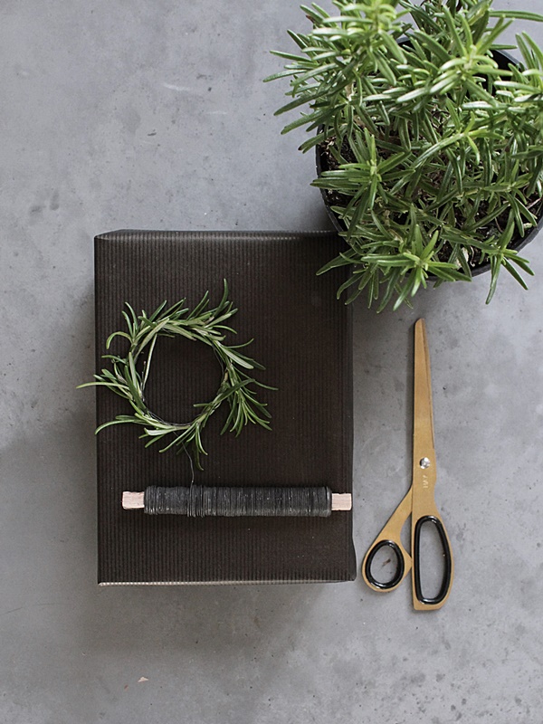 I've used: * black kraft paper, * a small box (I always save the little ones that come with a delivery), *rope, *dark flower wire, *tape, *scissors *tissue or blotting paper *small branches of rosemary